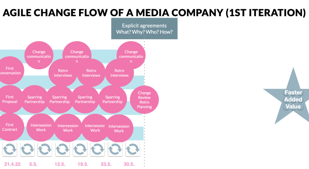 Following our motto of an agile journey to business agility, we suggested to our two sponsors that we proceed in manageable iterations with clear outcomes. What was important was that we only defined the expected outcomes more precisely for the next 2-6 weeks. For each of these iterations, agreed on the specific change formats, i.e. the flow of meetings, workshops, bilateral conversations, and intersessions we would use to achieve the expected outcomes. At the end of each iteration, we reflected on what we had actually achieved, how our collaboration had gone, and what conclusions we could draw from this for our next iteration.